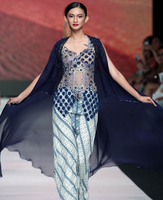 Siluet kebaya diplikasikan secara berbeda oleh Dessy Natalia. Ia menjadikannya serupa dress kemudian menambahkan lapisan material transparan.